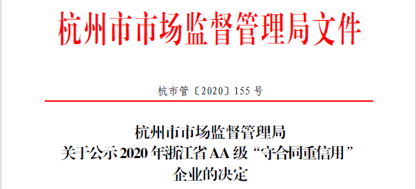 近日,2020年浙江省AA級(jí)“守合同重信用”企業(yè)名單公示,天寬榜上有名。這也是公司首次申報(bào)浙江省“守合同重信用”企業(yè),并獲準(zhǔn)直接參加AA級(jí)評(píng)定。