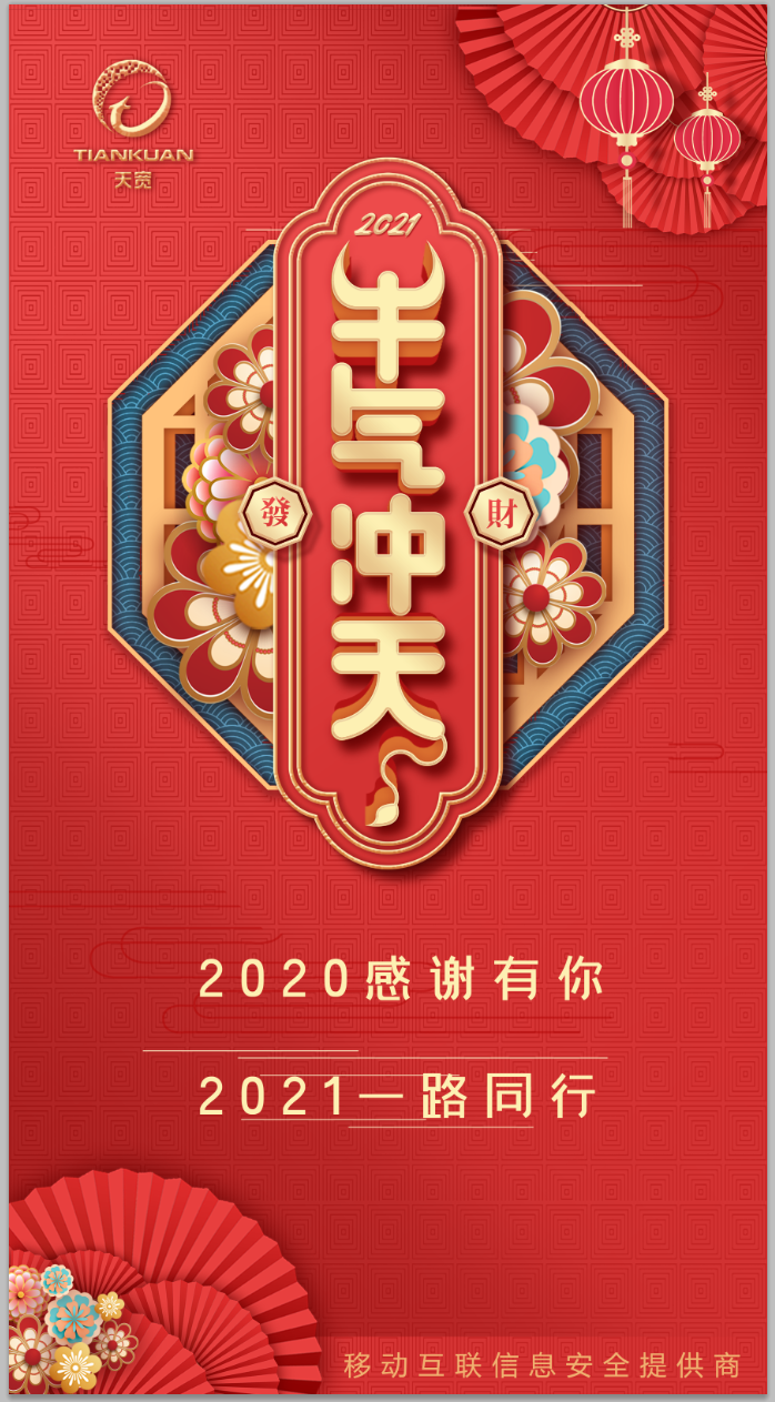 新元復始,萬象更新。在辭舊迎新之際,杭州天寬科技有限公司向所有的客戶、合作伙伴、股東和公司員工,以及關心和支持天寬發(fā)展的社會各界友人,致以最誠摯的祝福和最衷心的感謝!2020年,是極不平凡、充滿挑戰(zhàn)的一年,天寬牢牢把握信息安全行業(yè)發(fā)展的歷史機遇,充分發(fā)揮自主研發(fā)與技術創(chuàng)新的優(yōu)勢,以優(yōu)質(zhì)的產(chǎn)品和服務持續(xù)為客戶創(chuàng)造價值。這一年,在疫情的沖擊下,公司逆勢而上,取得了令人鼓舞的業(yè)績,凈利潤同比增長超過80%。市場占有率進一步提升,交付了多個十萬用戶數(shù)以上的大型項目;與浙江移動共同推出了“云端安全管控”產(chǎn)品,實現(xiàn)了產(chǎn)品及商業(yè)模式的創(chuàng)新;同時,我們?yōu)殡娏π袠I(yè)定制的天寬“新一代電力物聯(lián)網(wǎng)安全終端”在中電聯(lián)產(chǎn)品技術鑒定會上獲得國內(nèi)領先、國際先進的高度評價,產(chǎn)品已經(jīng)廣泛的在國網(wǎng)及南網(wǎng)各個省份得到規(guī)模商用,累積用戶數(shù)超過十萬。這一年,公司獲得了全球軟件領域最高級別CMMI5級認證,中國網(wǎng)絡安全企業(yè)100強,浙江省電子信息50家成長型企業(yè)等諸多榮譽,參與國家等保2.0相關標準的撰寫,并獲得西湖區(qū)科創(chuàng)直投基金千萬級投資,以及更多同行者的全方位支持。2021年,我們團結一心,攜手共進,開啟新征程。天寬將在保持營業(yè)收入與凈利潤持續(xù)增長的同時,積極加強和國家相關科研機構合作,通過技術研究、項目實踐,進一步提升移動互聯(lián)網(wǎng)/物聯(lián)網(wǎng)安全、數(shù)據(jù)安全治理、數(shù)據(jù)安全服務等領域的自主研發(fā)能力,夯實移動互聯(lián)信息安全領域的龍頭地位,使公司成為行業(yè)一流、國內(nèi)知名的具有競爭力和影響力的移動信息安全企業(yè)。以更貼合客戶場景的行業(yè)解決方案與安全服務,為電力、司法以及其他行業(yè)的客戶移動業(yè)務發(fā)展保駕護航。最后,再次送上最誠摯的問候和最衷心的祝福,祝大家在新的一年里身體健康,工作順利,闔家幸福!