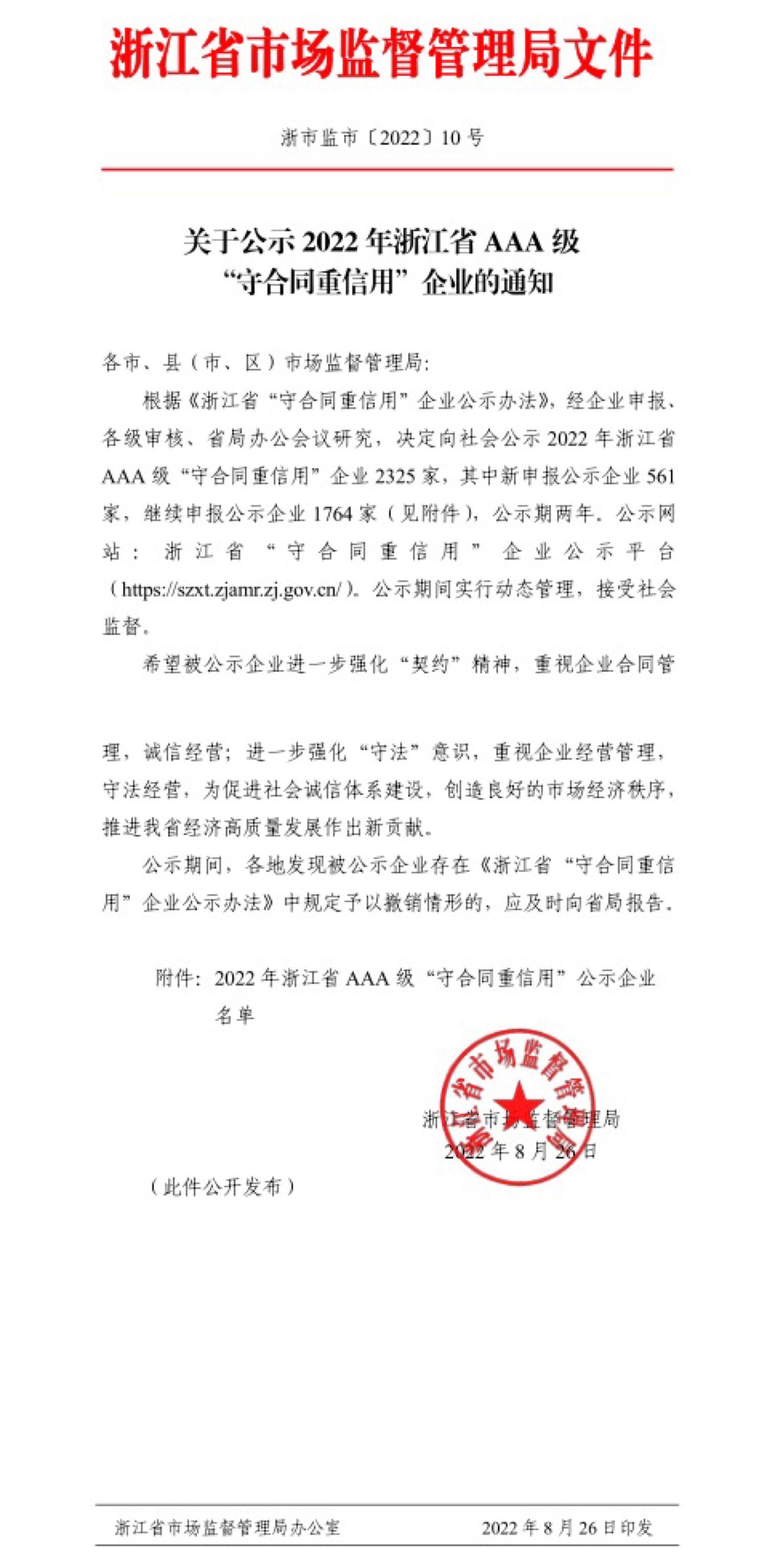近日,浙江省市場(chǎng)監(jiān)督管理局公布了2022年“浙江省守合同重信用企業(yè)”公示名單。天寬尊崇合同的契約精神,憑借自身良好的信用體系及誠(chéng)信守約形象,獲評(píng)浙江省AAA級(jí)“守合同重信用”企業(yè)。