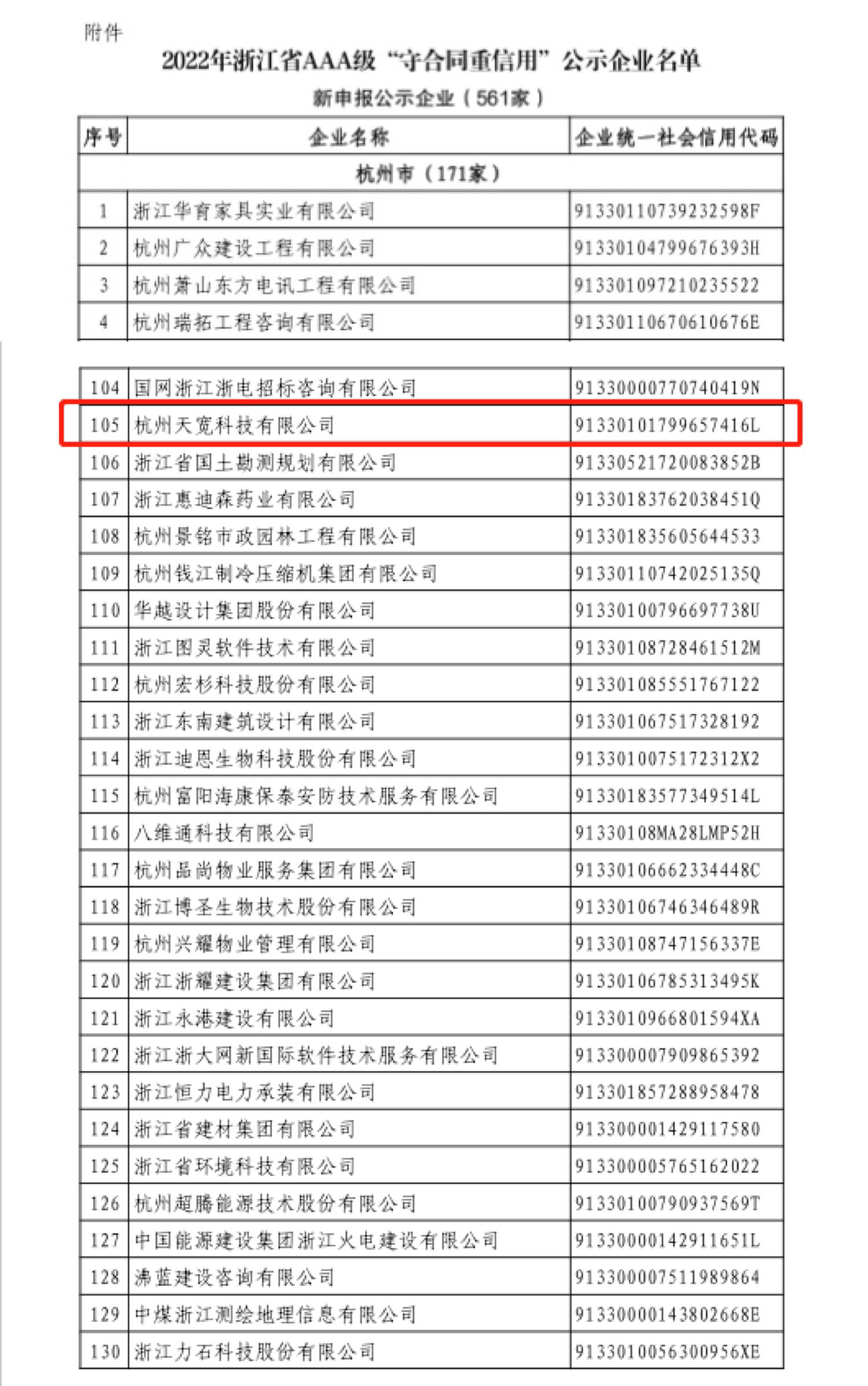 榮譽(yù)丨天寬榮獲浙江省aaa級(jí)“守合同重信用”企業(yè)稱號(hào)
