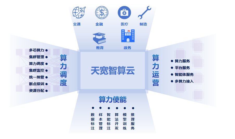 天寬智算云聚焦于為政企客戶與科研機構(gòu)構(gòu)建智能化轉(zhuǎn)型底座,通過提供“端到端一站式AI服務(wù)”,打通從底層算力資源供給到上層場景落地的全價值鏈。以高效、安全、開放的AI基礎(chǔ)設(shè)施(AI Infra)為核心,提供包括高性能AI算力、模型訓(xùn)練與推理加速、MAAS服務(wù)解決方案、行業(yè)AI咨詢、行業(yè)模型適配、智能體構(gòu)建服務(wù)在內(nèi)的一站式智能計算服務(wù)平臺,并通過行業(yè)級解決方案實現(xiàn)“場景化精準賦能”。