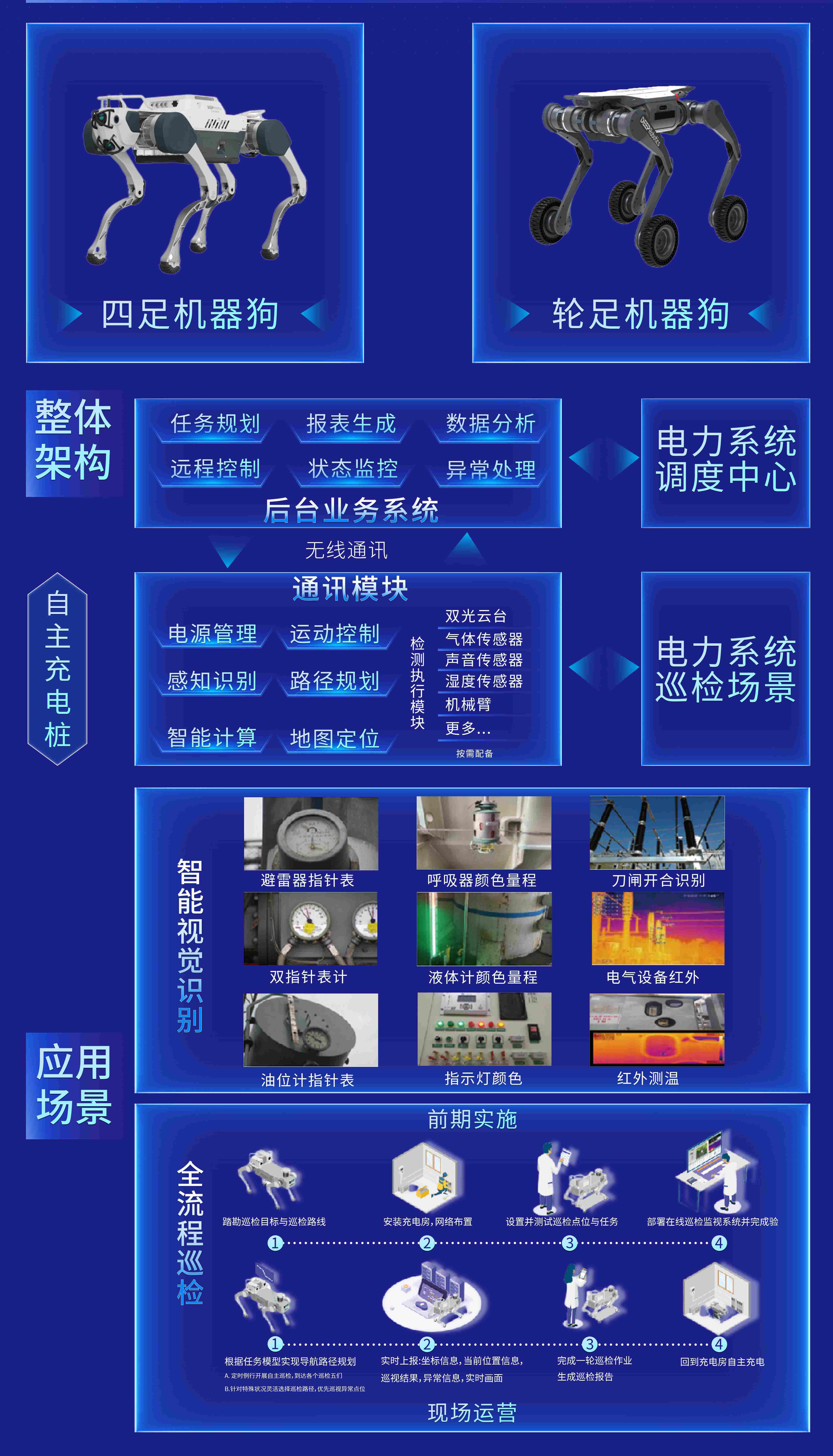 天寬精心打造的智能巡檢解決方案集成巡檢機(jī)器狗、專用監(jiān)測(cè)儀器/傳感器、自動(dòng)充電系統(tǒng)與智能管理系統(tǒng)。憑借AI視覺識(shí)別、IoT感知及機(jī)器狗協(xié)作的深度融合,該方案可實(shí)現(xiàn)基于路徑規(guī)劃和地圖定位導(dǎo)航的全自主巡查,涵蓋各類表計(jì)識(shí)別、設(shè)備工況監(jiān)測(cè)、局放檢測(cè)、溫濕度監(jiān)測(cè)、紅外測(cè)溫、氣體監(jiān)測(cè)、振動(dòng)監(jiān)測(cè)等多項(xiàng)指標(biāo)監(jiān)測(cè),可覆蓋超95%地形場(chǎng)景,定位精度誤差小于3厘米,巡檢識(shí)別準(zhǔn)確率高達(dá)95%,加速隱患識(shí)別與決策優(yōu)化,助力電力巡檢向精準(zhǔn)化、智能化升級(jí)。