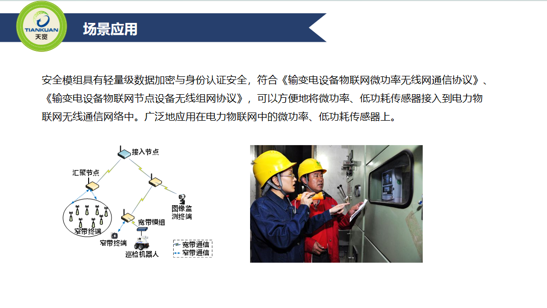 物聯(lián)網(wǎng)加密模組基于《輸變電設(shè)備物聯(lián)網(wǎng)微功率無線網(wǎng)通信協(xié)議》、《輸變電設(shè)備物聯(lián)網(wǎng)節(jié)點(diǎn)設(shè)備無線組網(wǎng)協(xié)議》,具有標(biāo)準(zhǔn)NB-IoT通訊能力,在模組中內(nèi)嵌密鑰生成、密碼運(yùn)算能力,可實(shí)現(xiàn)身份認(rèn)證、數(shù)據(jù)加解密功能,同時具有功耗小、成本低、無額外芯片、無需修改硬件設(shè)計(jì)、安全功能開發(fā)簡潔等優(yōu)勢??梢苑奖愕貙⑽⒐β省⒌凸膫鞲衅鹘尤氲诫娏ξ锫?lián)網(wǎng)無線通信網(wǎng)絡(luò)中。廣泛地應(yīng)用在電力物聯(lián)網(wǎng)中的微功率、低功耗傳感器上。