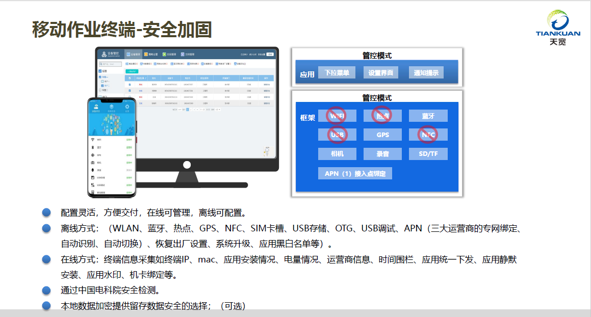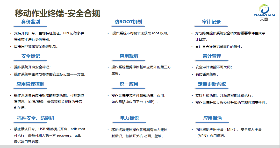 新入網(wǎng)移動(dòng)作業(yè)終端的管控要求: 從 2019 年1月1日起,移動(dòng)作業(yè)終端的設(shè)備型號(hào)應(yīng)通過中國(guó)電科院統(tǒng)一入網(wǎng)安全檢測(cè),并提供檢測(cè)報(bào)告。2019年5月7日,國(guó)網(wǎng)互聯(lián)網(wǎng)部發(fā)布440號(hào)文件《國(guó)家電網(wǎng)有限公司關(guān)于移動(dòng) 終端及應(yīng)用整合實(shí)施的指導(dǎo)意見》,進(jìn)一步明確要求將終端 ROM 定制技術(shù)納入采購技術(shù)規(guī)范中。2020年2月21日,《國(guó)家電網(wǎng)有限公司關(guān)于印發(fā)2020年互聯(lián)網(wǎng)專業(yè)工作要點(diǎn)的通知》79號(hào)發(fā)文要求:禁止未經(jīng)認(rèn)證授權(quán)的終端接入,終端禁止在不同大區(qū)交叉使用。