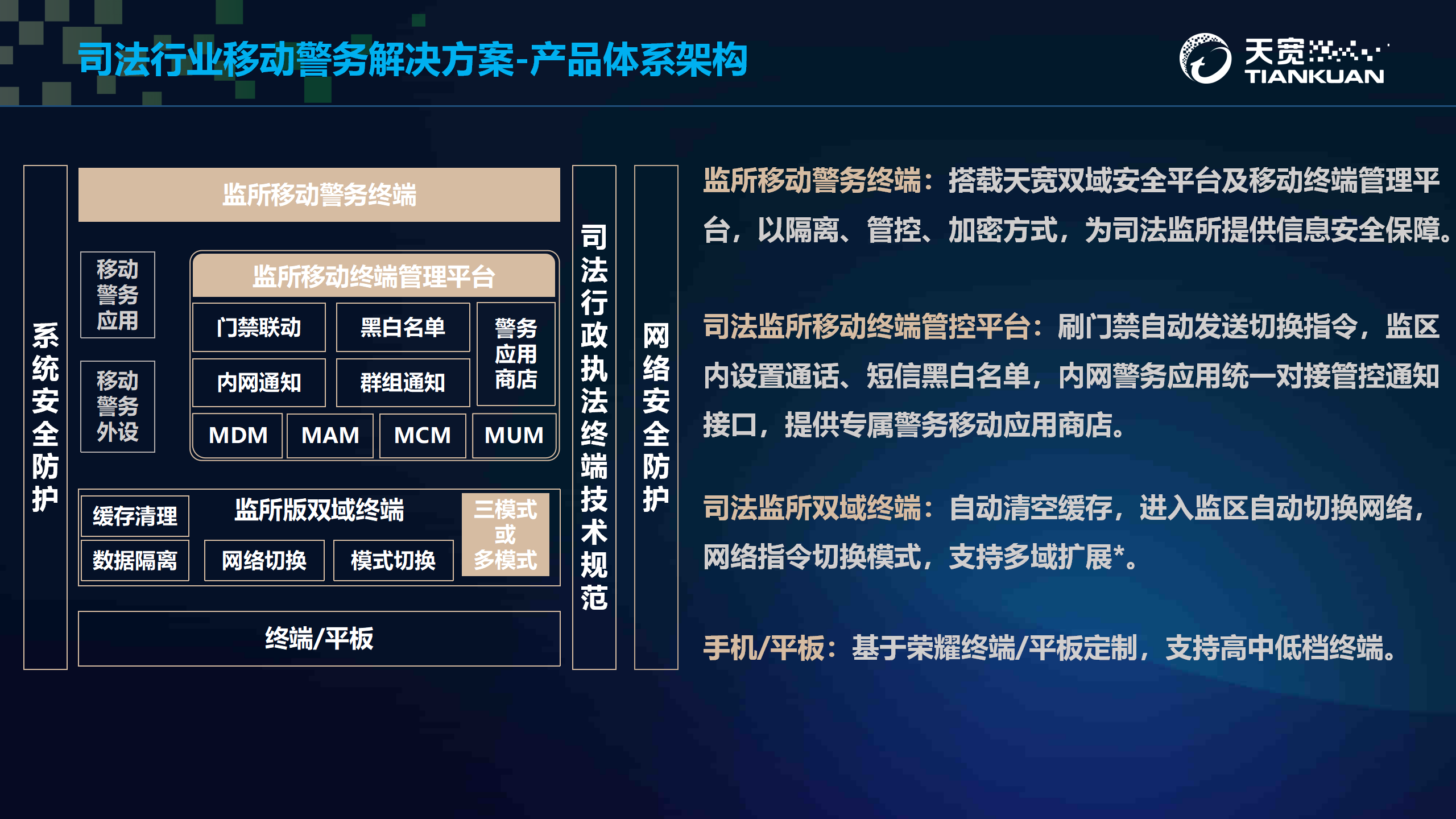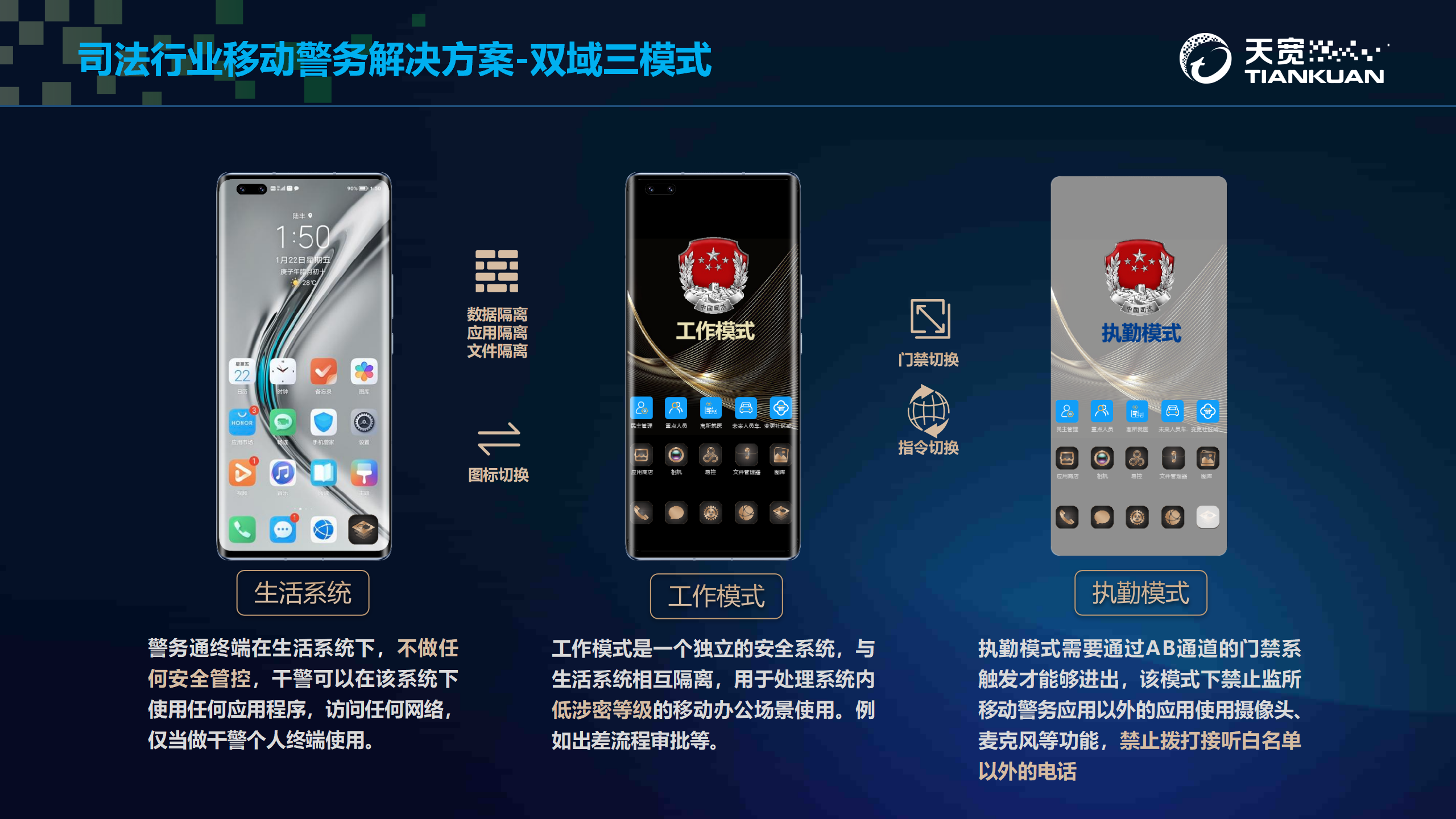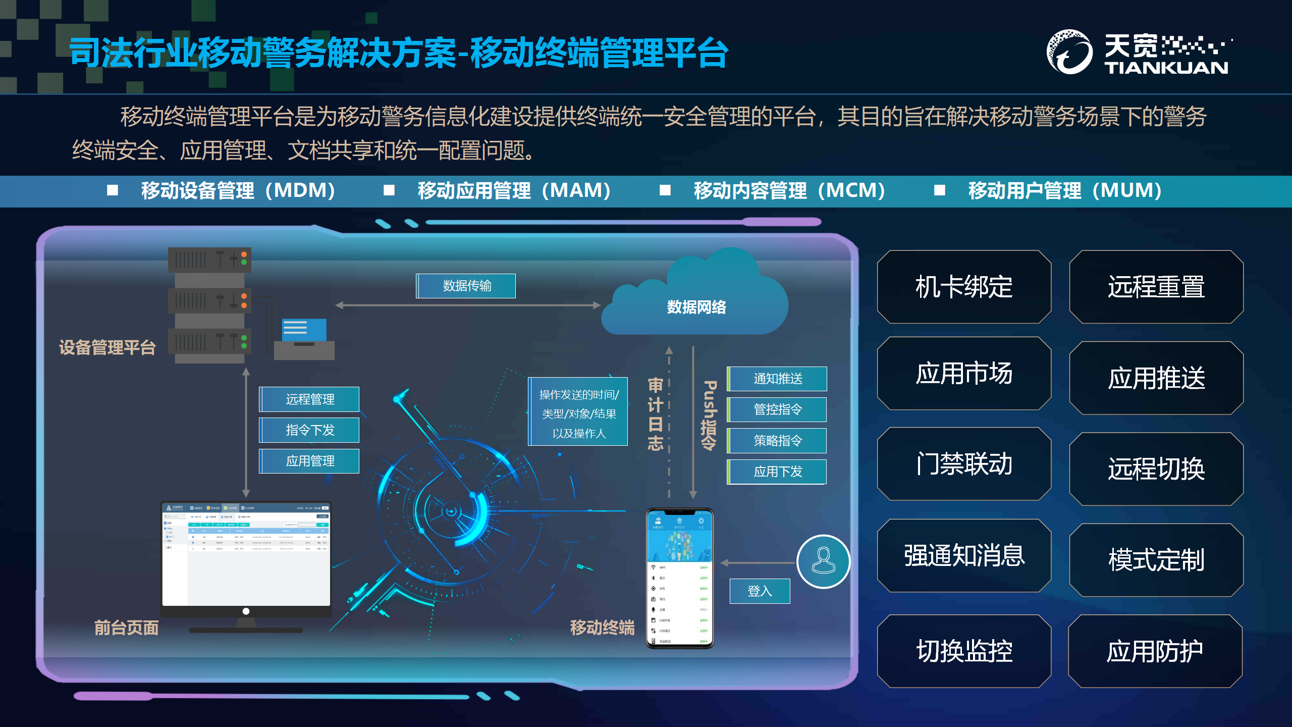 移動終端管理平臺是為移動警務(wù)信息化建設(shè)提供終端統(tǒng)一安全管理的平臺,其目的旨在解決移動警務(wù)場景下的警務(wù)終端安全、應(yīng)用管理、文檔共享和統(tǒng)一配置問題。搭配使用搭載天寬雙域安全平臺的制定智能終端,以隔離、管控、加密方式,在確保數(shù)據(jù)安全,防止涉密信息泄露的基礎(chǔ)上,實(shí)現(xiàn)辦公移動化,增強(qiáng)司法管理工作機(jī)動性,實(shí)現(xiàn)管理“智慧化”,提高管理運(yùn)營水平。